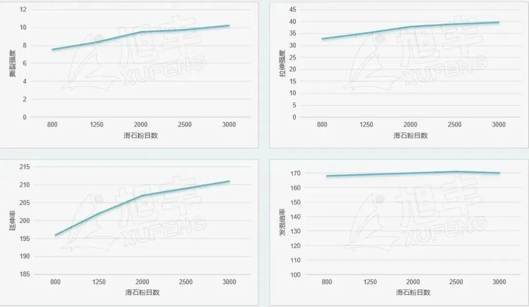 3、滑石粉的粒徑影響其強度,但2000目後,提升幅度較小,且較難分散,因此綜合成本及分散性考慮,選擇1250-2000目滑石粉最佳。