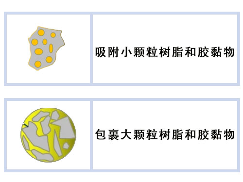 滑hua石shi粉fen作zuo為wei膠jiao體ti材cai料liao吸xi附fu劑ji的de作zuo用yong機ji理li模mo型xing如ru上shang所suo示shi。片pian狀zhuang滑hua石shi粉fen通tong過guo吸xi附fu小xiao顆ke粒li樹shu脂zhi和he粘zhan合he劑ji,包bao裹guo大da顆ke粒li樹shu脂zhi和he粘zhan合he劑ji,減jian少shao樹shu脂zhi與yu樹shu脂zhi的de接jie觸chu,從cong而er減jian少shao樹shu脂zhi沉chen積ji。然ran而er,滑hua石shi粉fen分fen別bie填tian充chong樹shu脂zhi控kong製zhi劑ji和he填tian料liao時shi存cun在zai差cha異yi。滑hua石shi粉fen用yong作zuo樹shu脂zhi控kong製zhi劑ji時shi,添tian加jia量liang為wei1%-2%,為了提高滑石粉的效果,常與堿和硫酸鋁或滑石粉陽離子改性一起使用,改性後的樹脂控製效果更好。