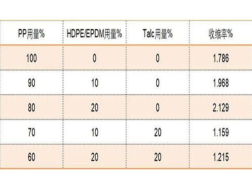 聚丙烯(PP)、高密度聚乙烯(HDPE)和三元乙丙橡膠(EPDM)dengshiqicheneiwaishijianfuhecailiaodejitizufen,yijubingxiweizhucai,gaomidujuyixihesanyuanyibingxiangjiaoweitianjiaji,sanzhedezhiliangbibutong,cailiaodeshousuolvyeyoujiaodadechabie,rubiao1所示。表1 HDPE、EPDM、Talc對PP收縮率的影響注:HDPE與EPDM的質量比為1:1,Talc為1250目。從表1可以看出,純PP的…