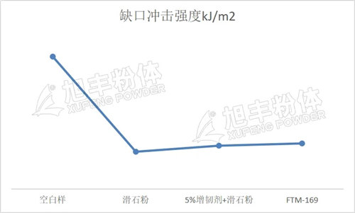 從上圖可以看出,FTM-169較添加5%增韌劑體係,具有較高的懸臂梁缺口衝擊強度,同時相對添加滑石粉後下降的幅度最小,這說明FTM-169在ABS樹脂中可以大大減輕因滑石粉產生的衝擊強度下降,具有良好的增韌效果。