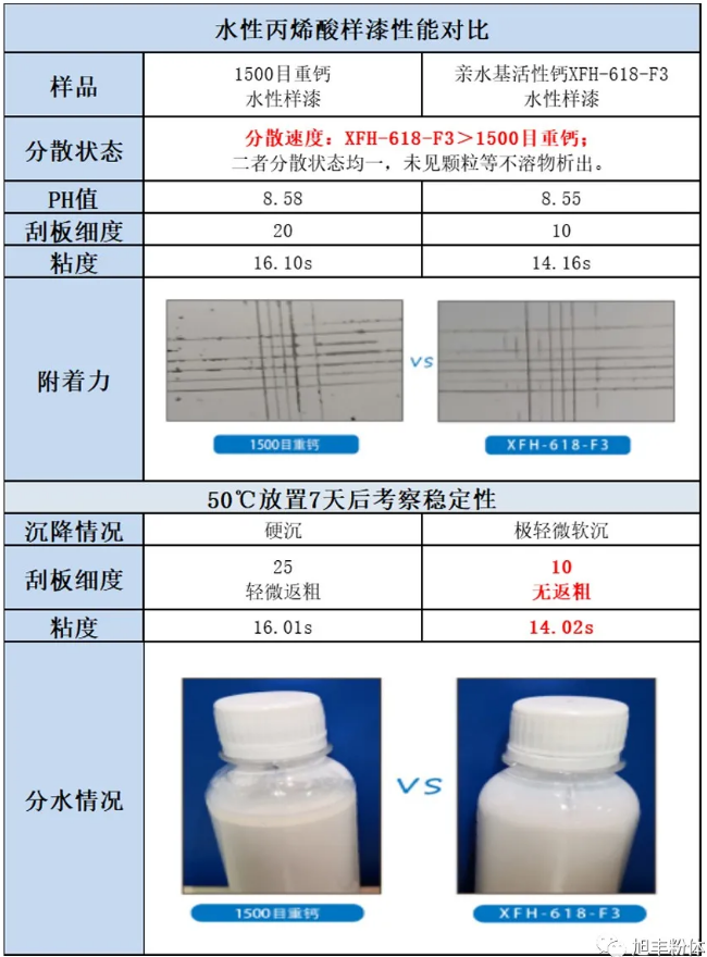 對比可知:親水基活性鈣XFH-618-F3比普通1500目重鈣潤濕速度快、分散效果好,附著力及儲存穩定性提高。更多應用信息或獲取樣品請來電谘詢,旭豐粉體竭誠為您服務!
