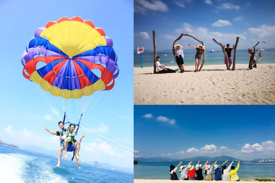 在蜈支洲島,靜可欣賞潔淨透明的海水,秀麗的風景。動可乘坐豪華遊艇出海、玩轉帆船、浮潛、垂釣、背上滑翔傘,翱翔藍天。