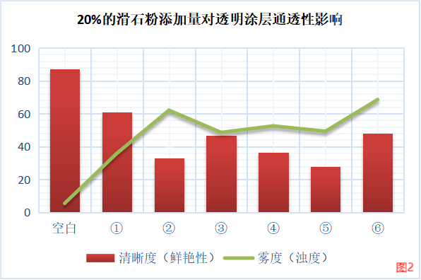 綜上①滑石粉具有明顯優異於其他滑石粉的透明性,同時在高比例下仍可保持較優異的清晰度和低霧度,可見①滑石粉為透明級滑石粉,比一般滑石粉更適用於如木器塗料的透明體係中。