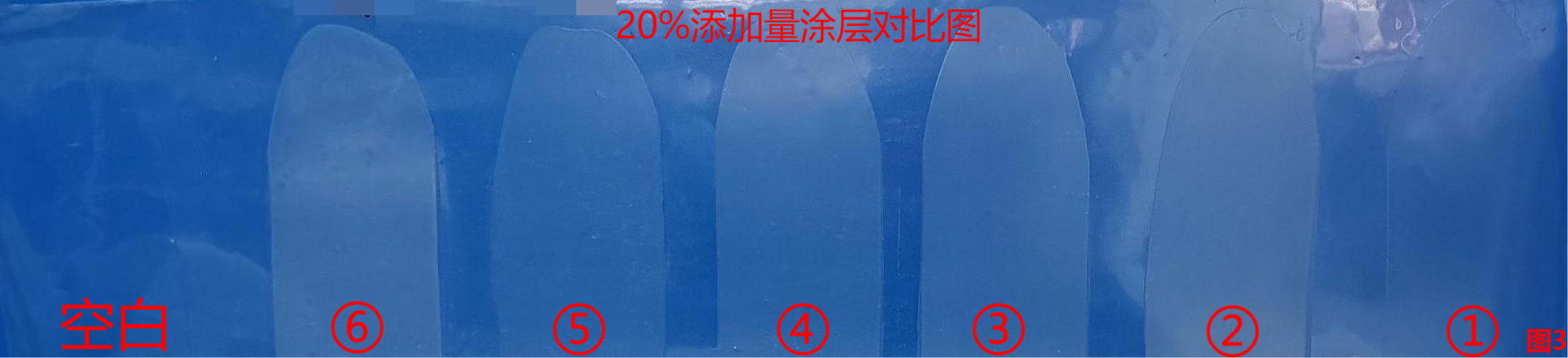 同時使用霧度儀ASTM標準,測試400-700nm波長下,添加20%滑石粉塗層的霧度(濁度)和清晰度(鮮豔性)如上圖2,①滑石粉在20%添加比例下仍可以保持較好的清晰度,對塗層的濁度外觀影響較小;整體的外觀情況如下圖3。